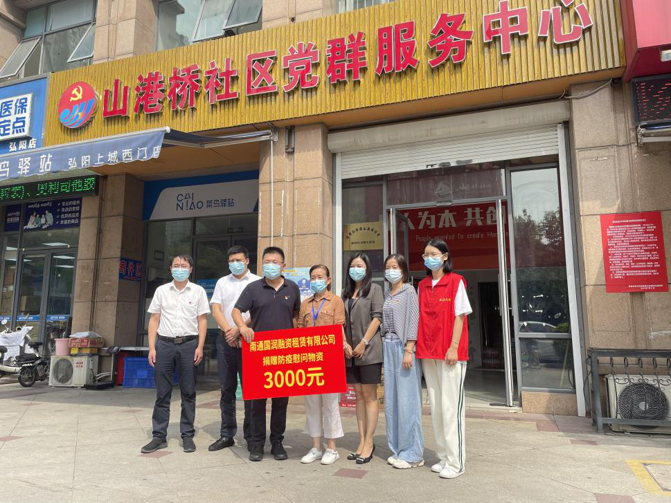 8月26日下午,南通國(guó)潤(rùn)融資租賃有限公司支部書(shū)記、董事長(zhǎng)陳大鵬同志,帶領(lǐng)公司主要領(lǐng)導(dǎo)班子及黨員干部走訪了觀音山街道山港橋社區(qū)防疫一線,同時(shí)捐贈(zèng)價(jià)值3000元的愛(ài)心物資,并委派兩名同志下沉,積極參與社區(qū)疫情防控志愿服務(wù)工作。